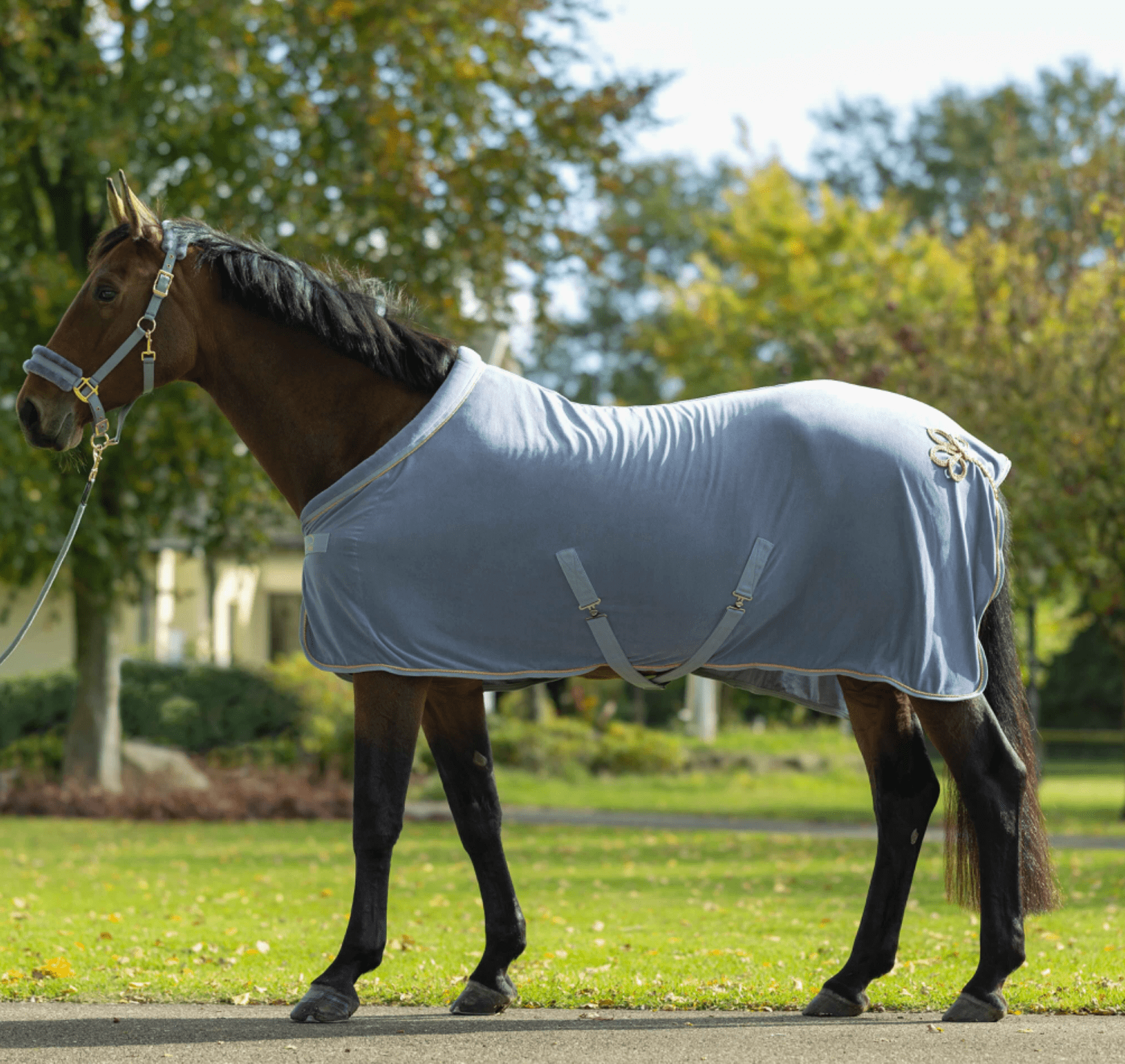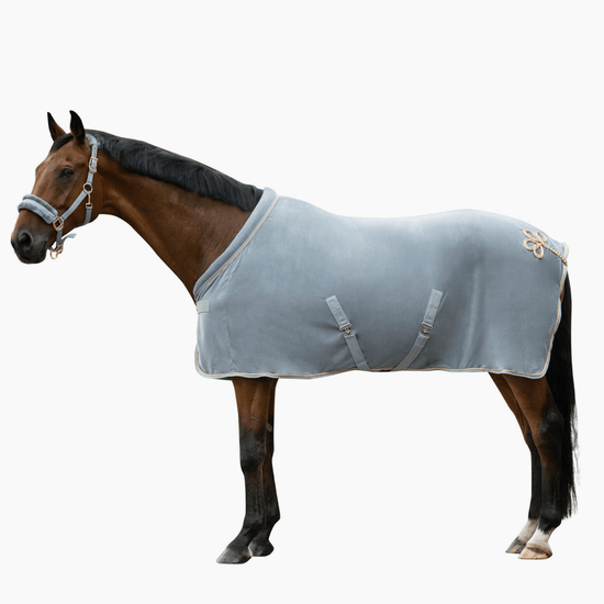 Elegant fleecetäcke med roseguldsdetaljer, andasfunktion och effektiv fukttransport. Perfekt som svettäcke eller stalltäcke för hästar som förtjänar både komfort och stil.