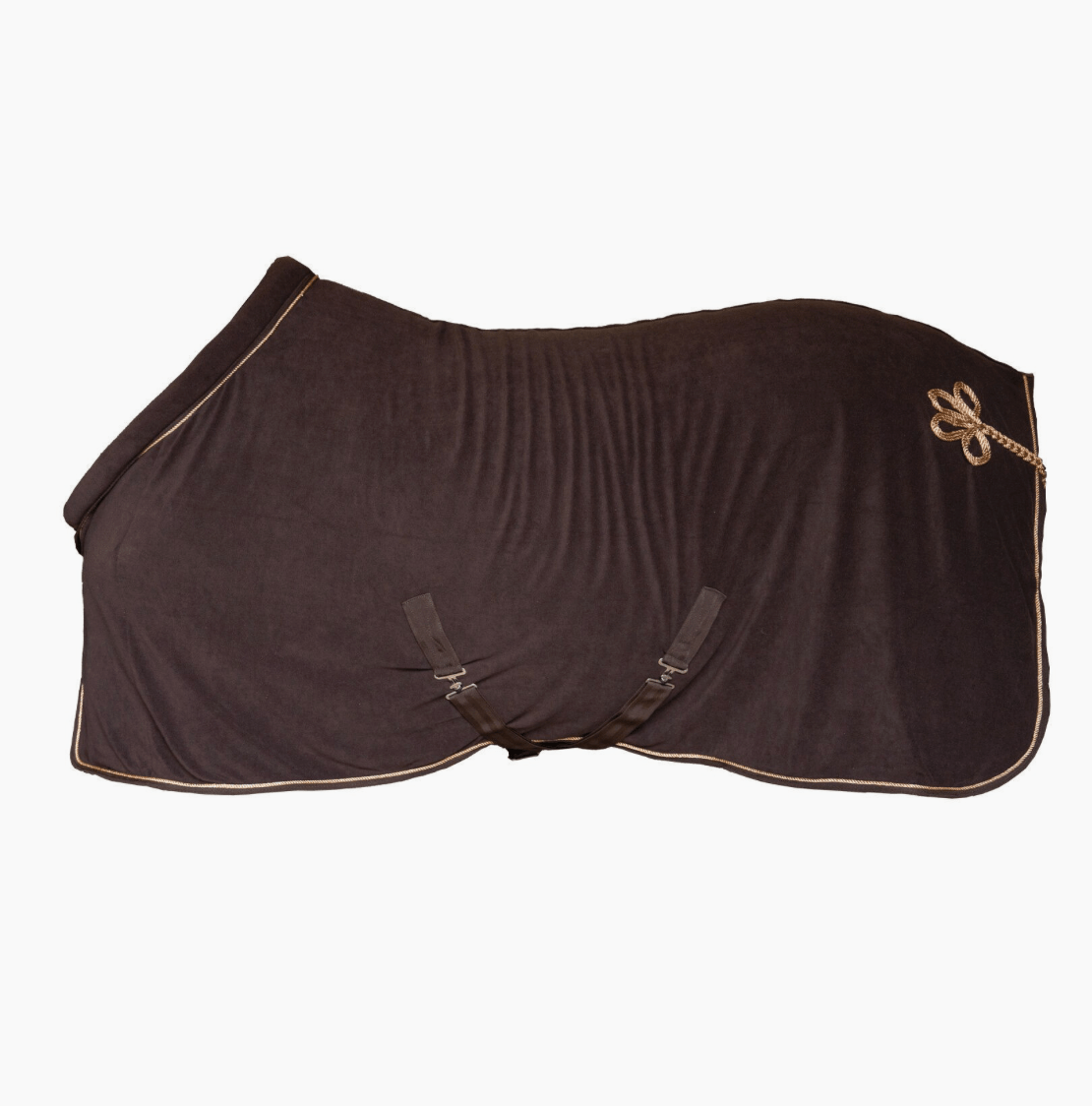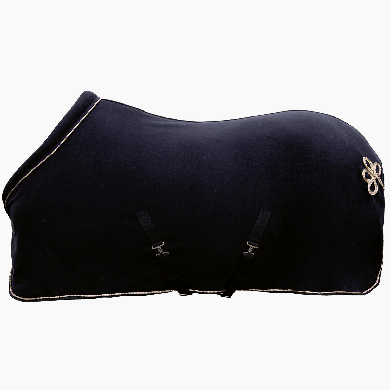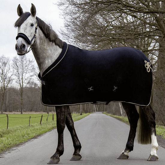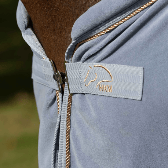 Detta täcke från HKM har en mjuk, tät fleece som både andas och absorberar svett – perfekt för att förhindra att hästen kyls ner efter träning. De dekorativa roseguldsdetaljerna längs kanten och den exklusiva applikationen bak ger täcket en stilfull finish som sticker ut i mängden.