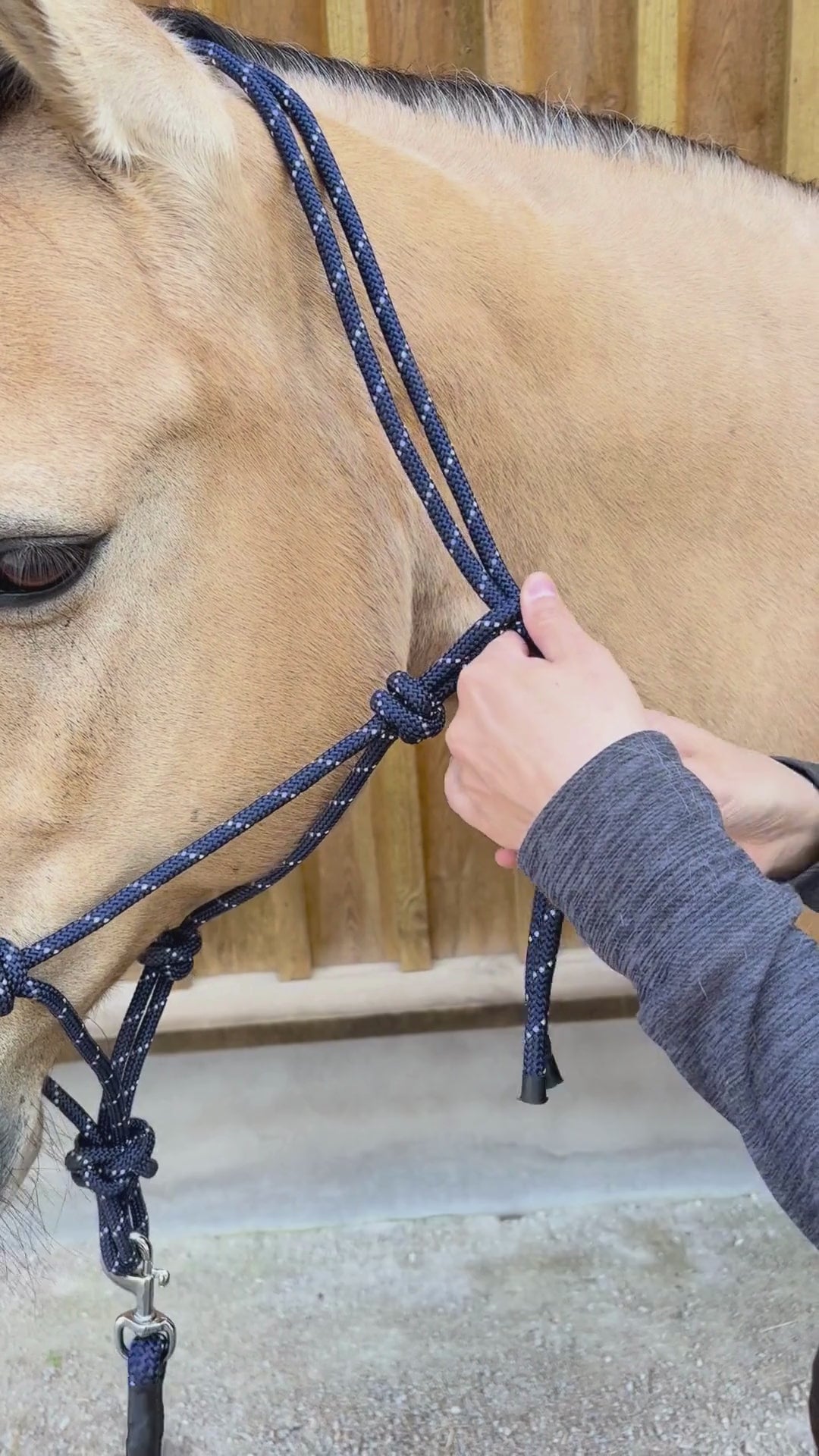 Grimman är utformad för att passa perfekt på din hästs huvud och garanterar en trygg och bekväm passform. Knutarna är utformade för att hamna på rätt plats och bakom ganaschen. Så du behöver aldrig oroa dig för att grimman ska glida av eller skava på din hästs känsliga hud.