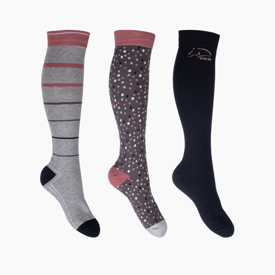 Ridstrumpor Miami 3-pack finns i två olika färgkombinationer. Varje paket innehåller tre par med matchande men varierade designer, vilket gör dem enkla att kombinera med ridbyxor och övrig ridutrustning.