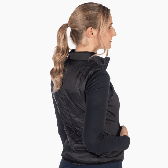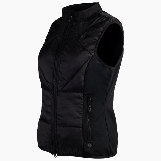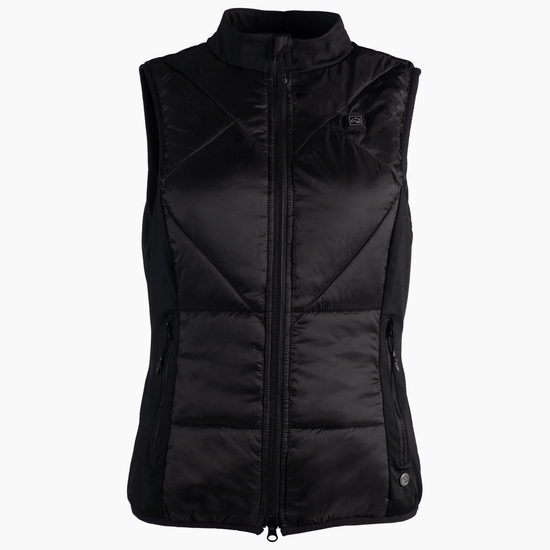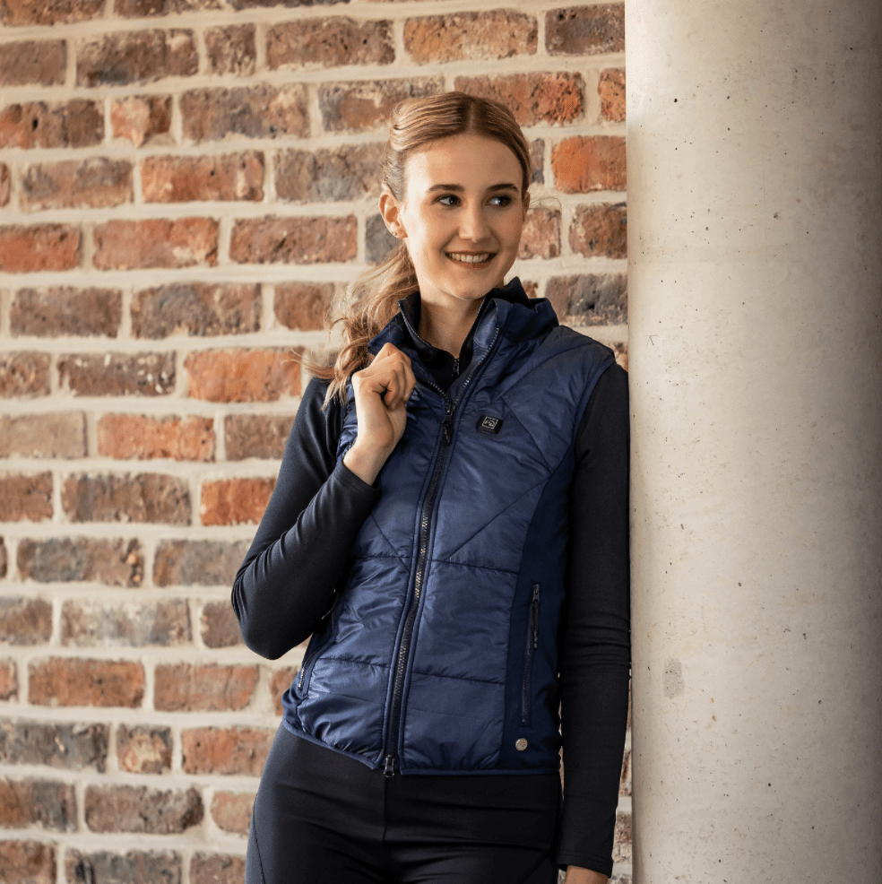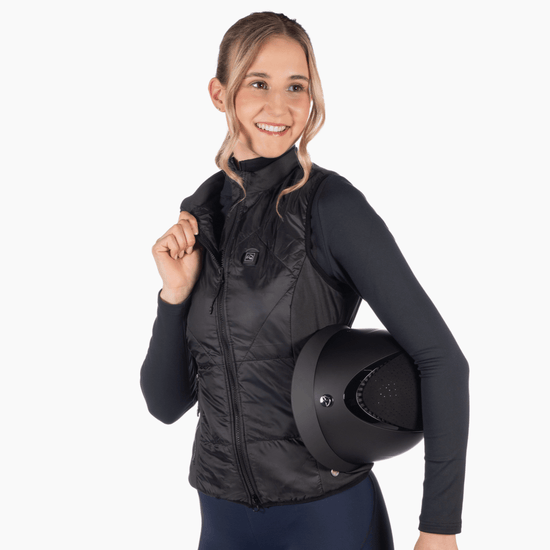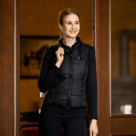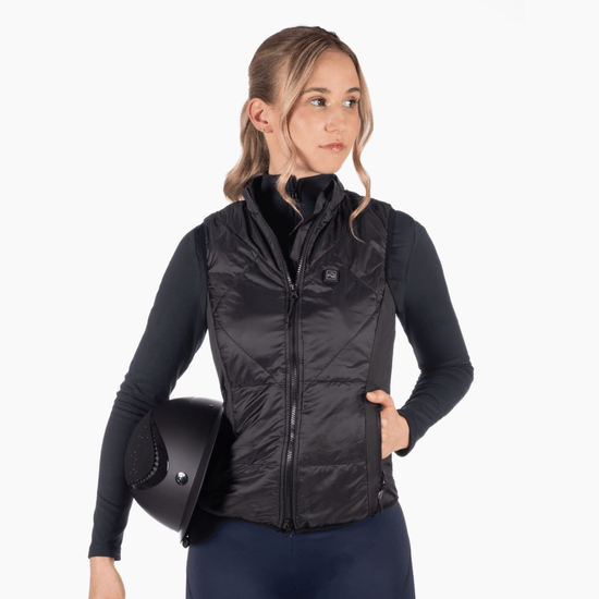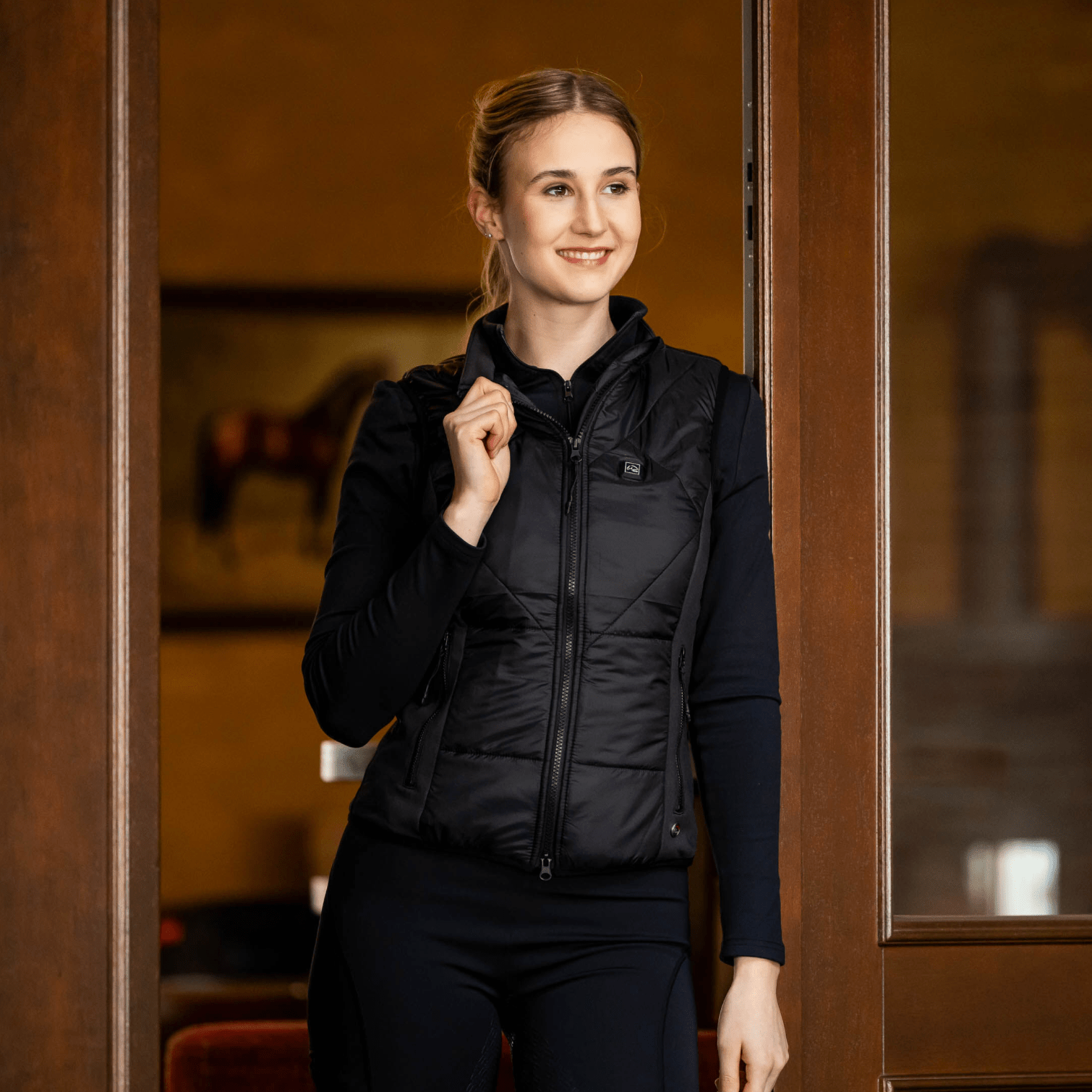 Elegant värmeväst för ridning med justerbar temperatur via knapp. Powerbank 5000 mAh ingår. Slimmad passform, 2-vägsdragkedja och elastiska sidor för maximal komfort.